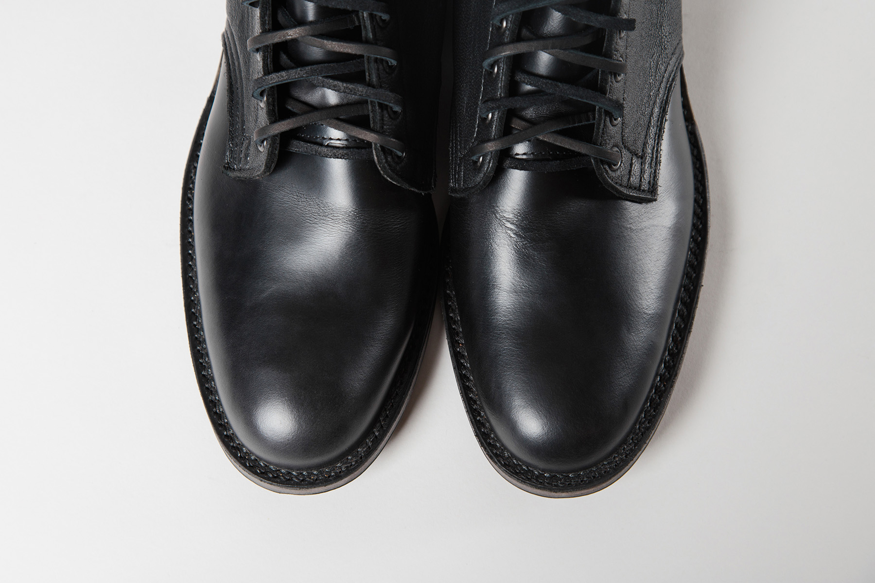 The final wings+horns Ten Year project is a collaboration with the respected boot makers at Viberg on a custom Service Boot. Continuing the 10th anniversary theme of premium mixed materials and tonal contrasts, the wings+horns x Viberg Service Boot is constructed from black Horween Chromexcel leather and pebbled moose hide on a 2030 last, and features a greased leather sole, gunmetal eyelets and black leather laces.